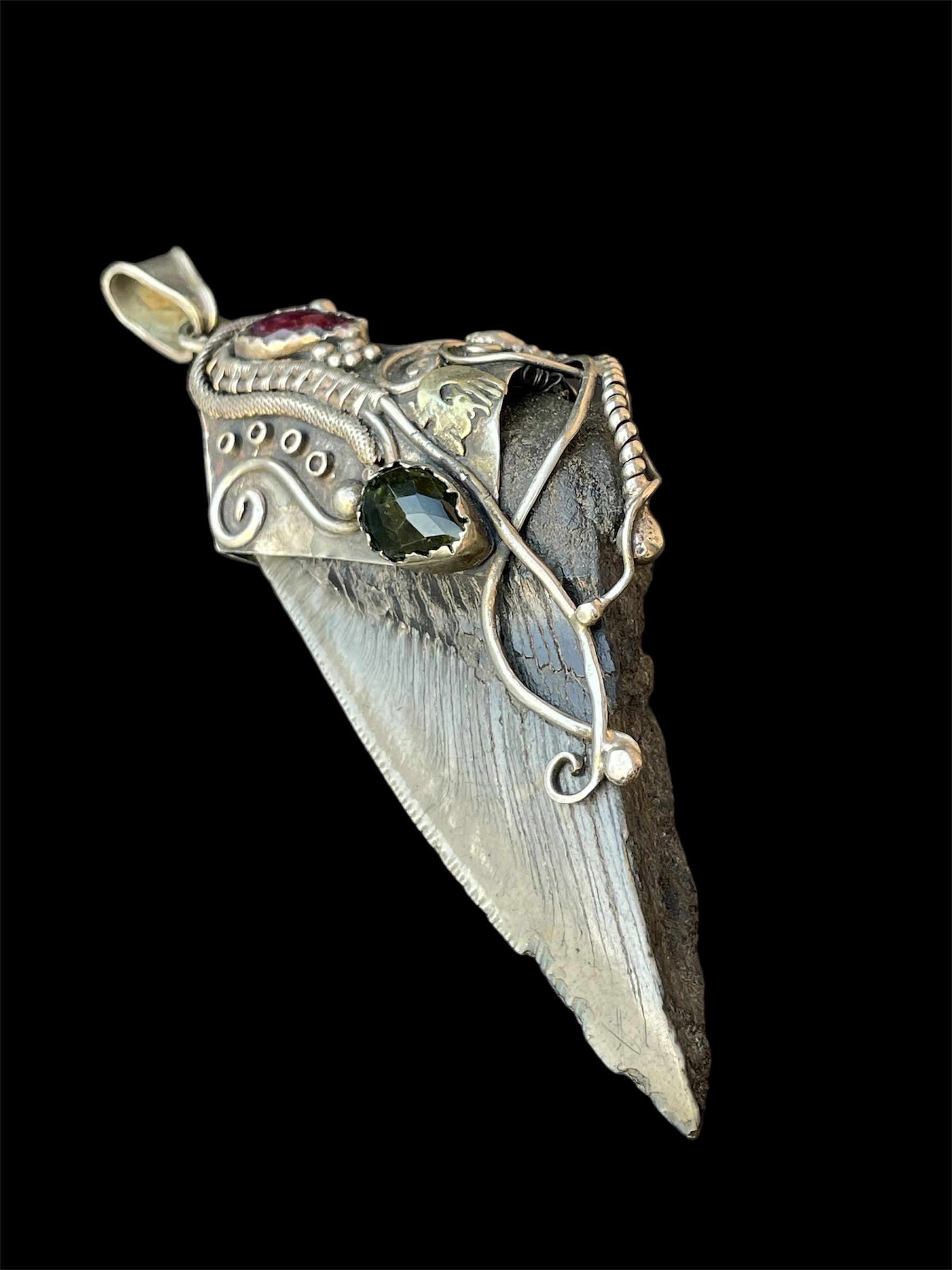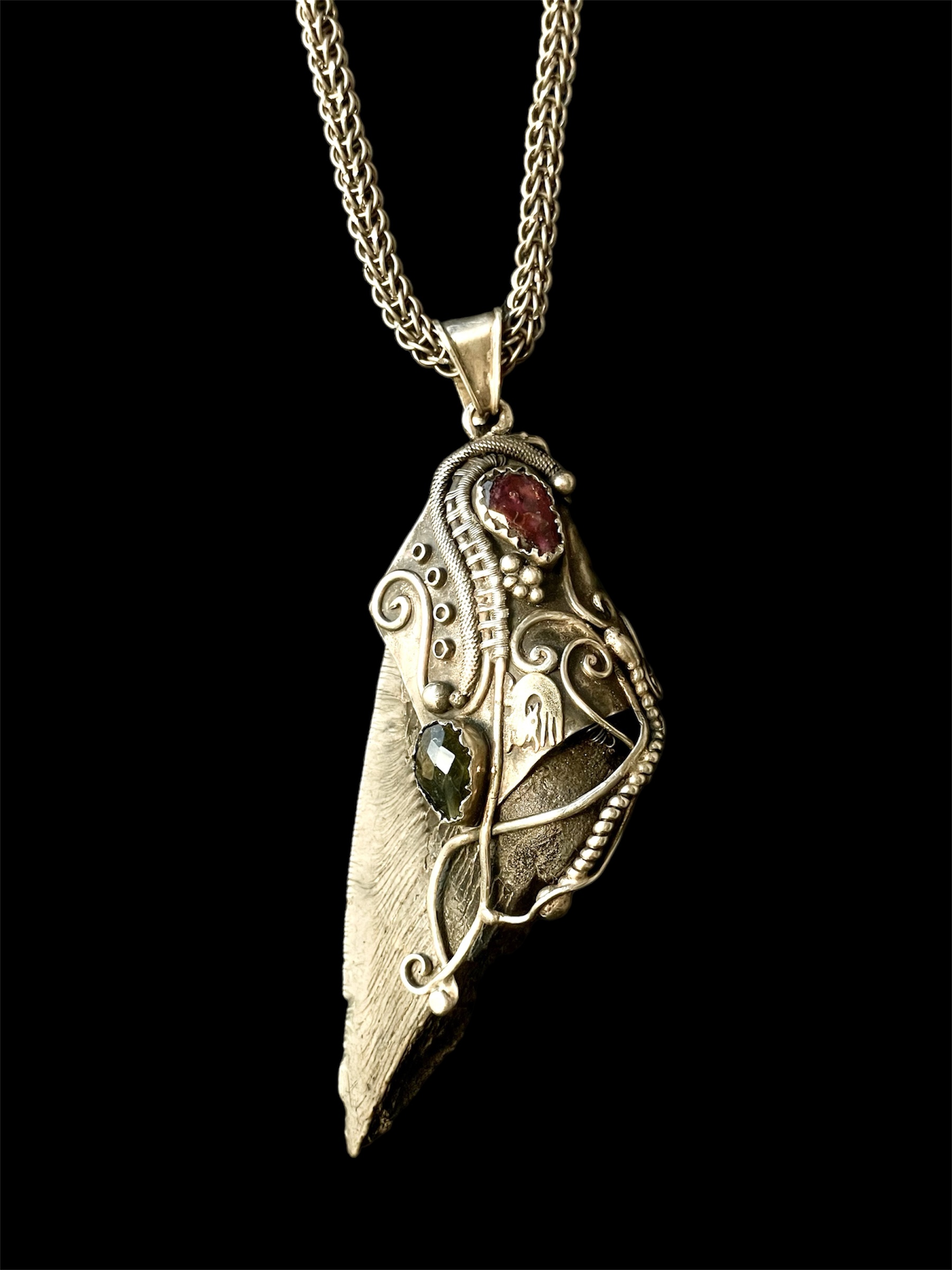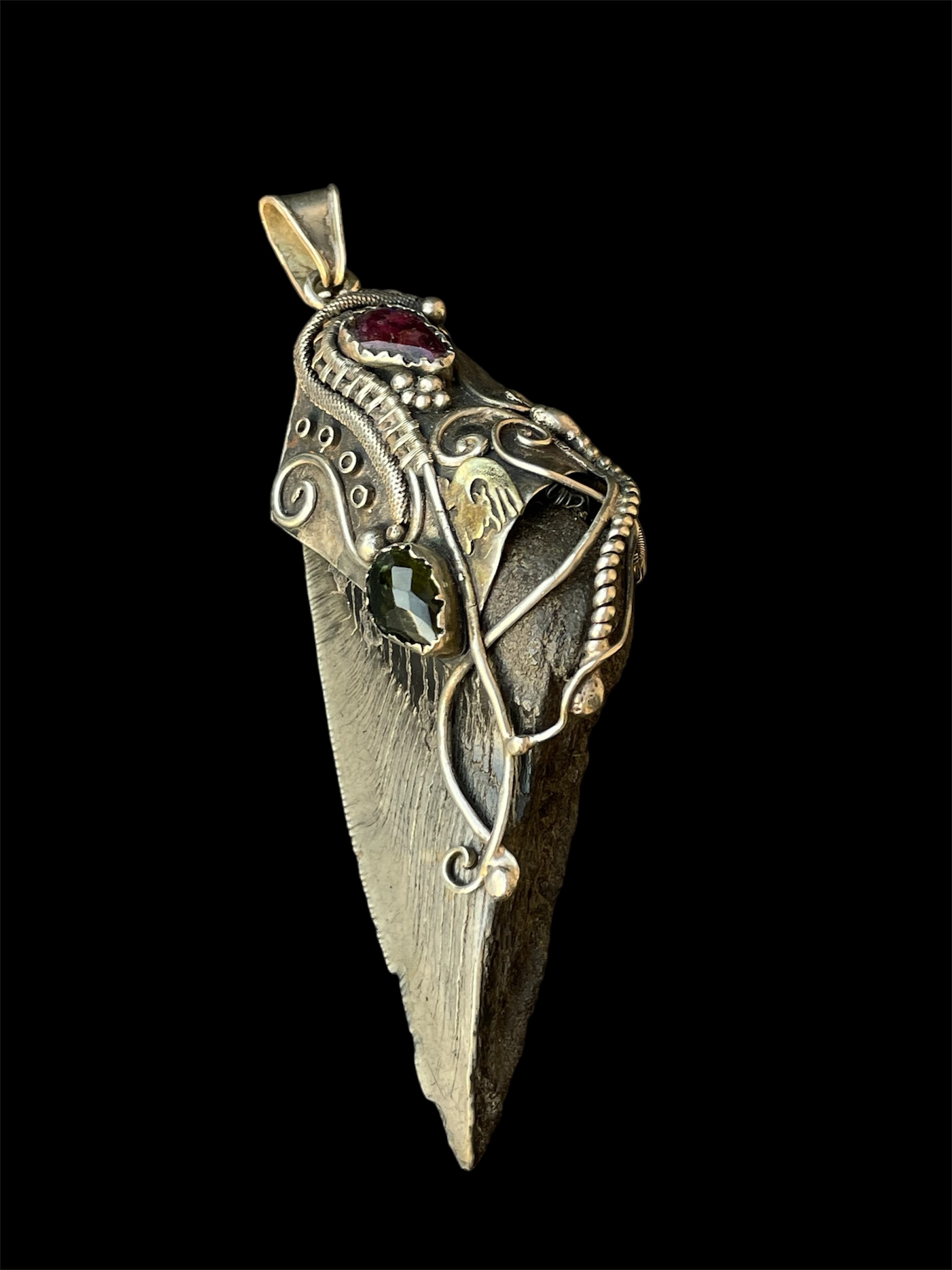 These pendant made from fossil megalodone shark tooth and tourmaline stones. Material is silver.