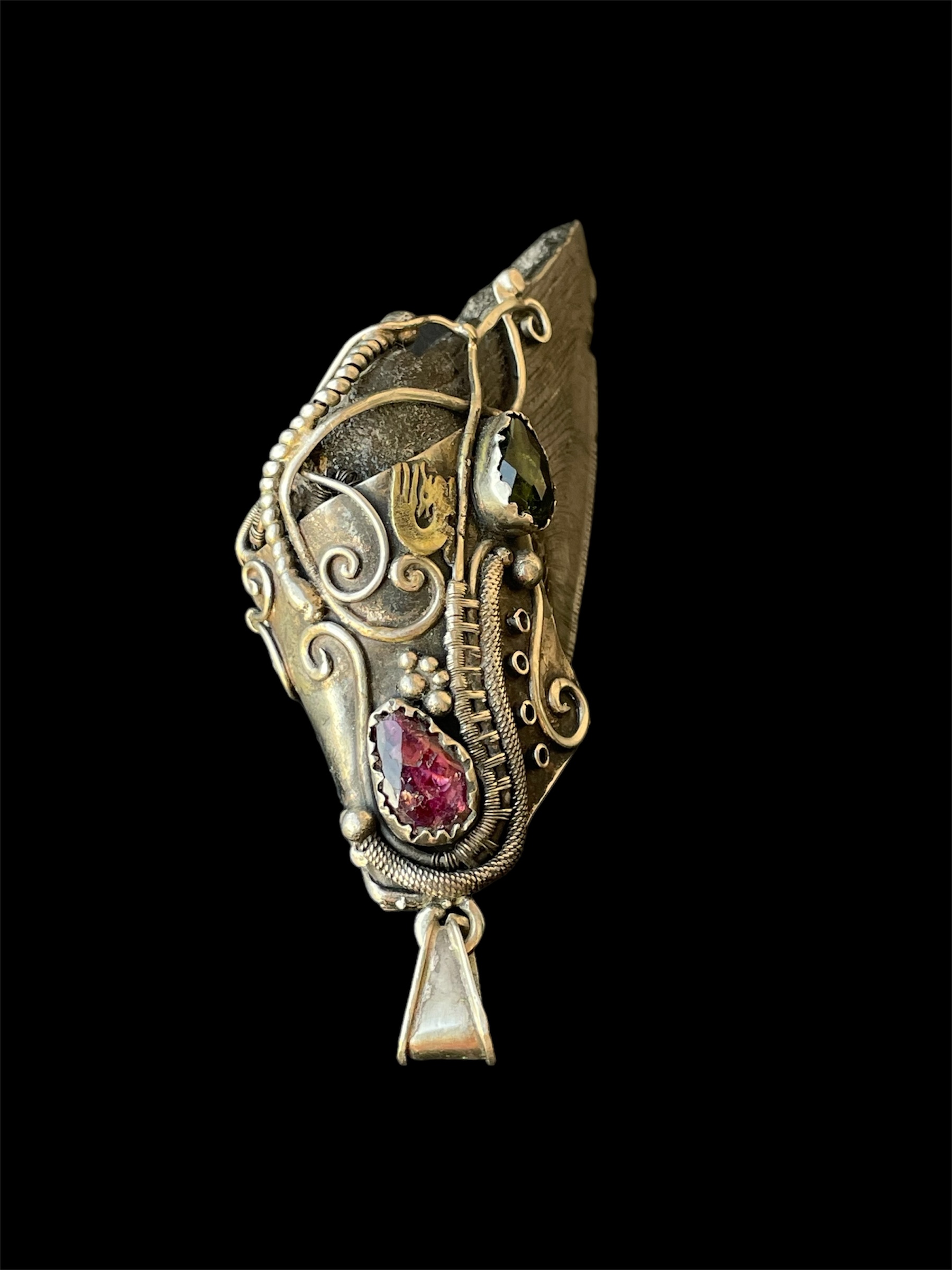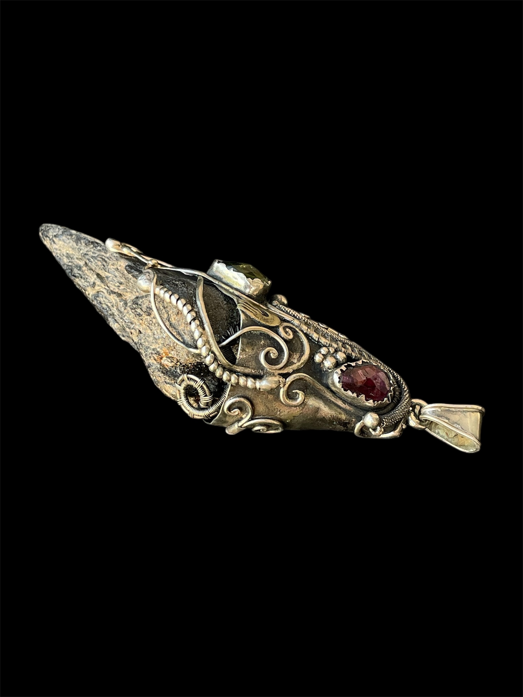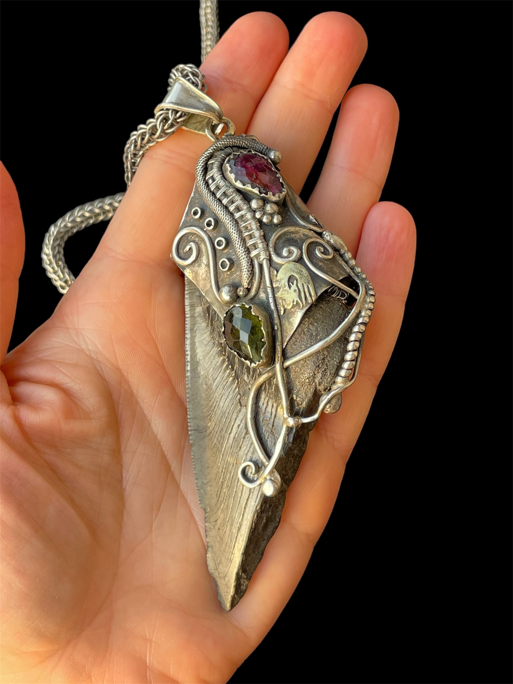 These pendant made from fossil megalodone shark tooth and tourmaline stones. Material is silver.