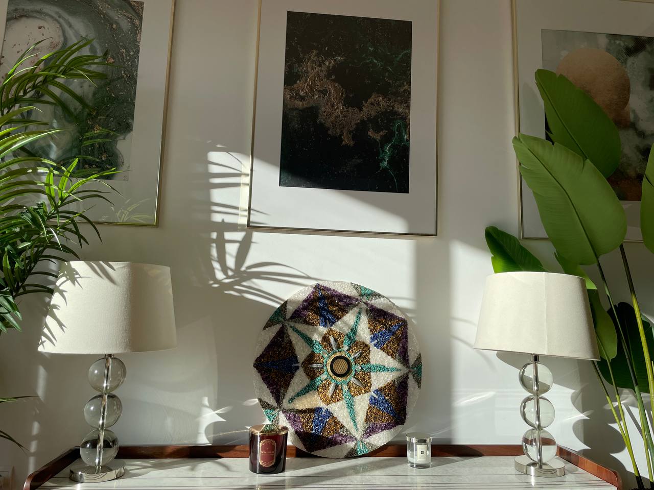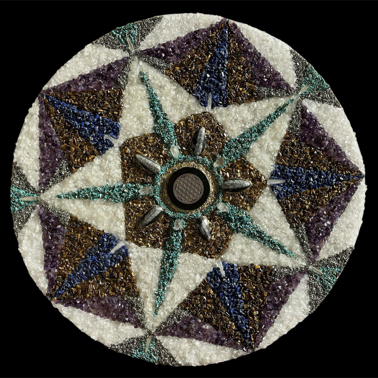 This work is created with the powerful protective stones and that also help to take root (obsidian, fossil orthocera, tiger’s eye), the quartz that enhances the energy of other stones, lapis lazuli and turquoise stones of communication and expression.